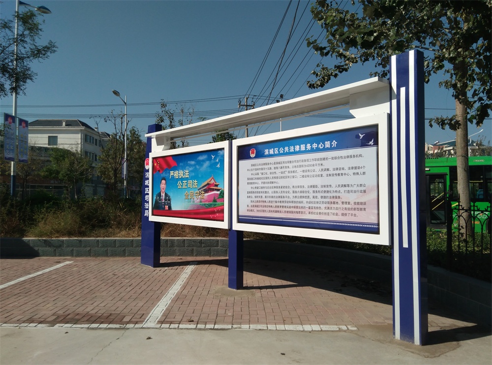 濱州市濱城區(qū)司法局宣傳欄,2015年10月22日安裝于濱州市黃河15路渤海8路路口東南角—濱城區(qū)法治中心。