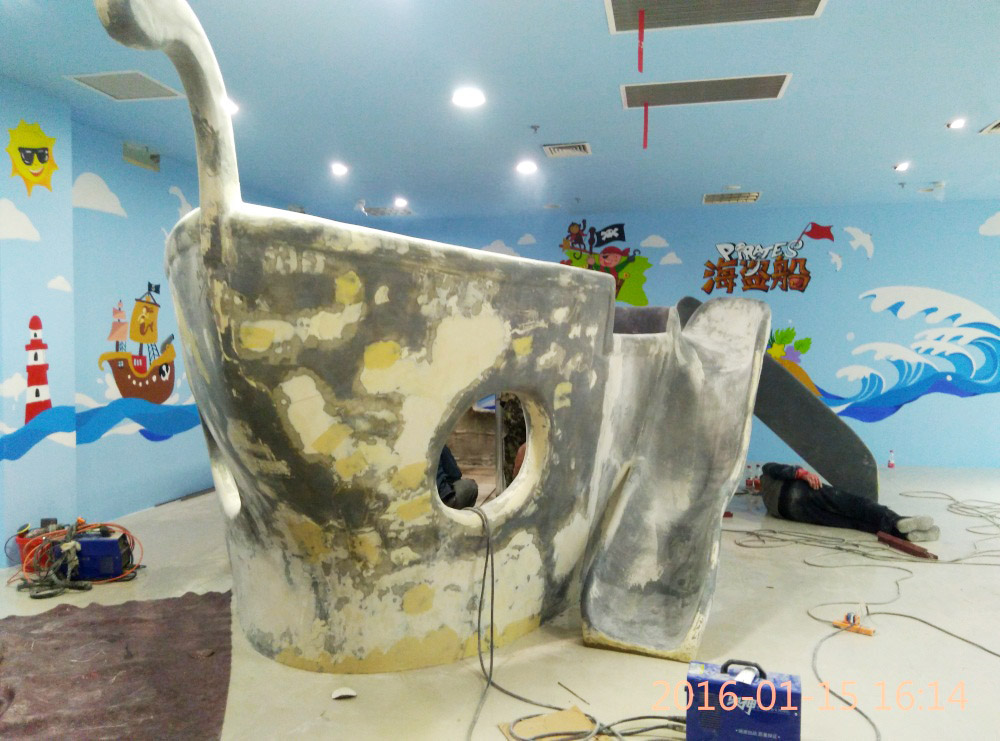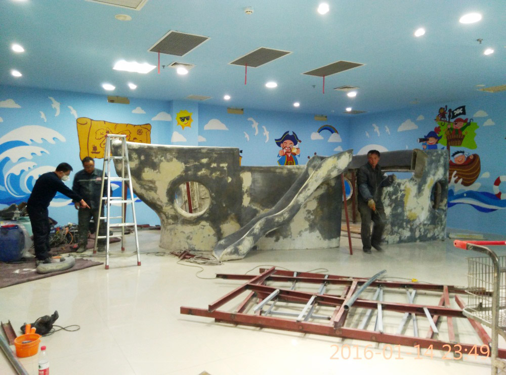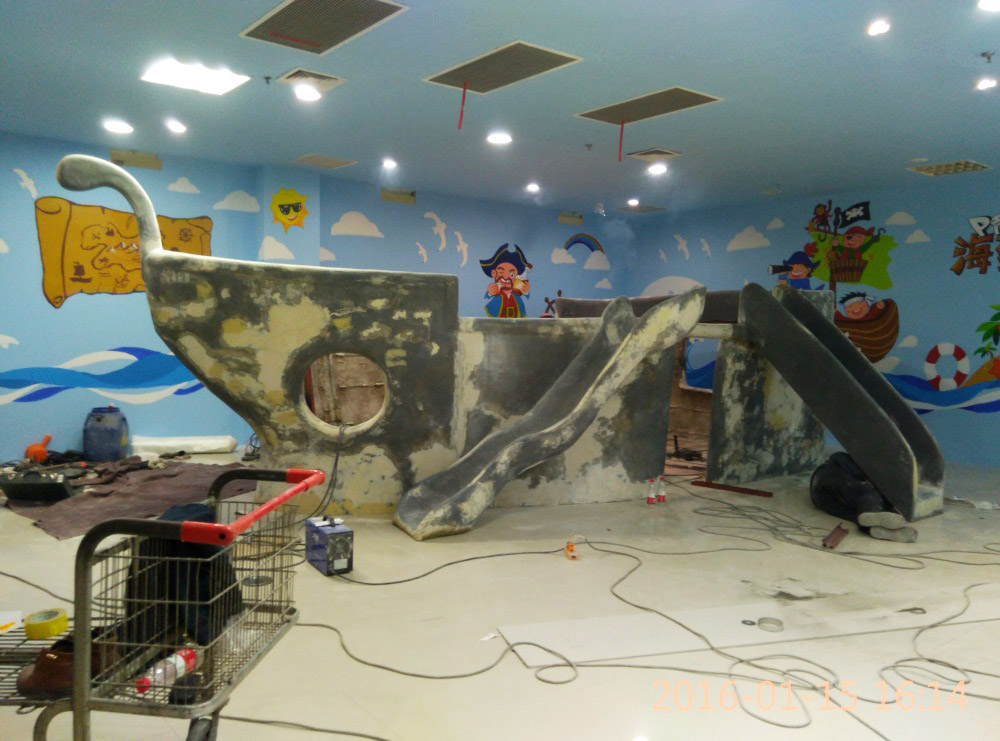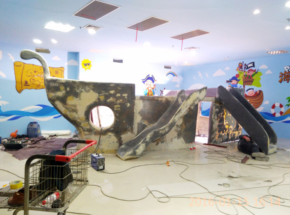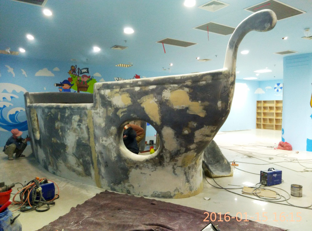 大型玻璃鋼游樂船雕塑竣工。2016年1月15-1月19日安裝于山東省濱州市黃河五路渤海十路銀座商城黃河店四樓。