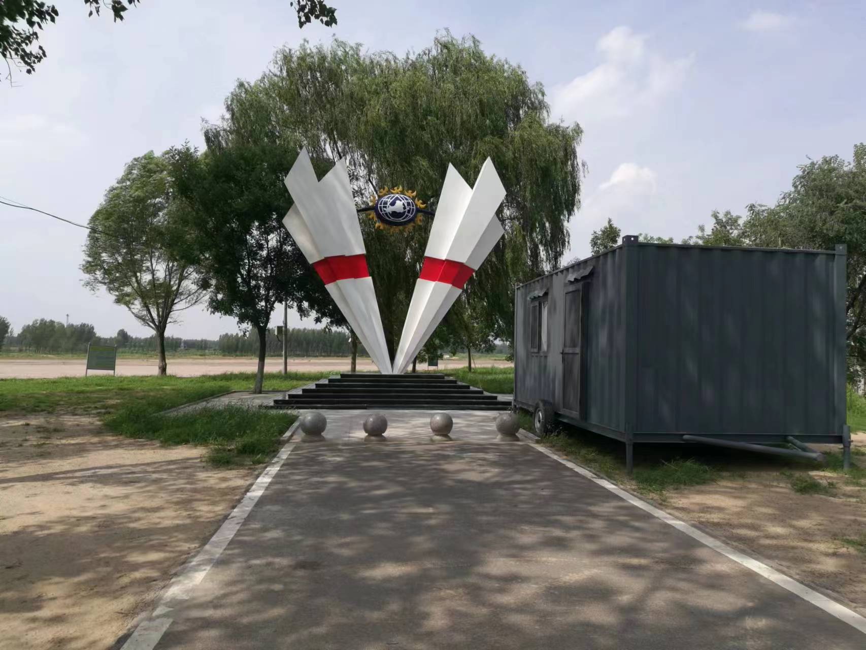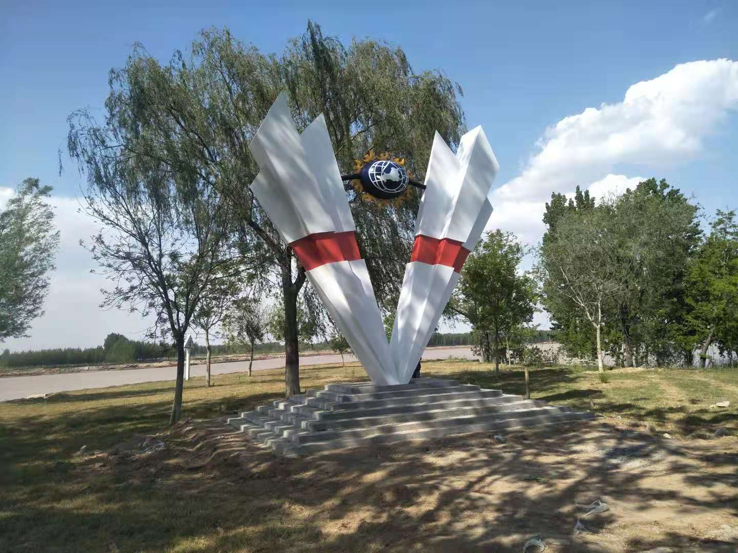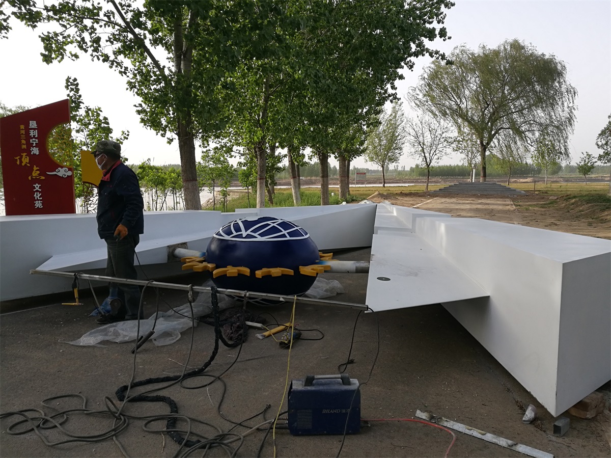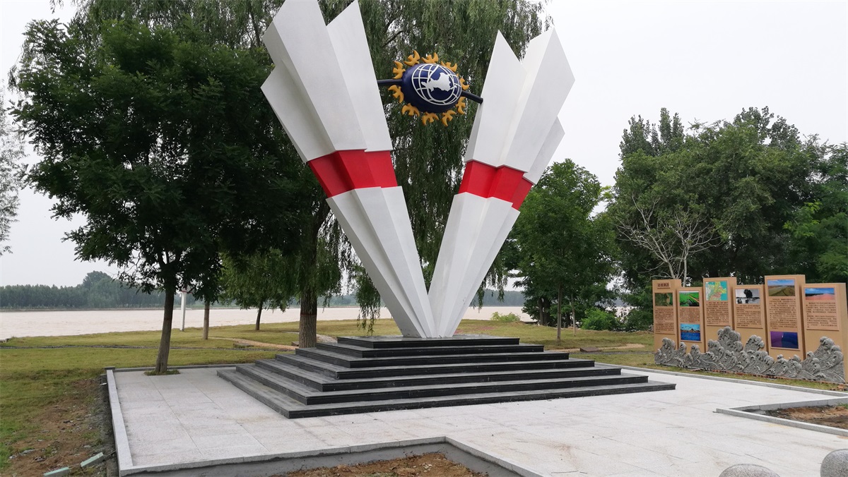 雕塑整體呈扇形構(gòu)造,代表黃河三角洲扇形外貌;兩側(cè)形似利劍,寓意治黃工作者敢于“亮劍”的拼搏精神; 中間球形,寓頂點(diǎn)之意;其上印制有黃河水利委員會標(biāo)志,圍繞十只和平鴿。寓意以治黃事業(yè)為中心、人民幸福、和平安寧、生態(tài)保護(hù)、空間均衡;主體色彩以紅、黃、藍(lán)搭配。紅色代表黨建引領(lǐng),黃、藍(lán)象征海河交匯。寓意治黃事業(yè)在中國共產(chǎn)領(lǐng)導(dǎo)下開創(chuàng)新篇章。