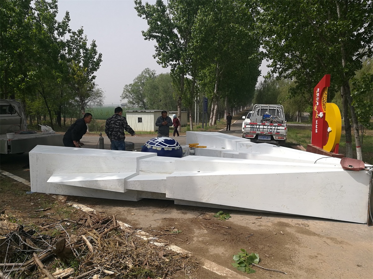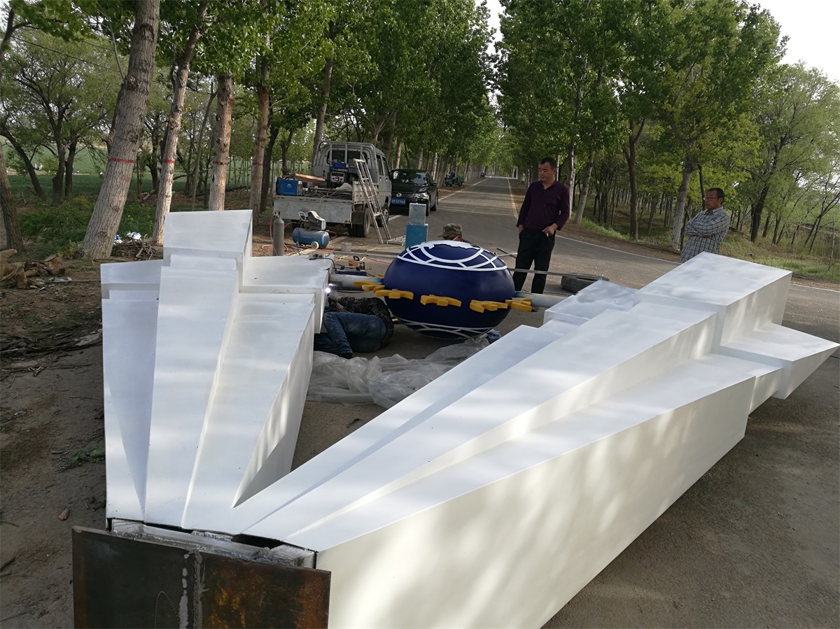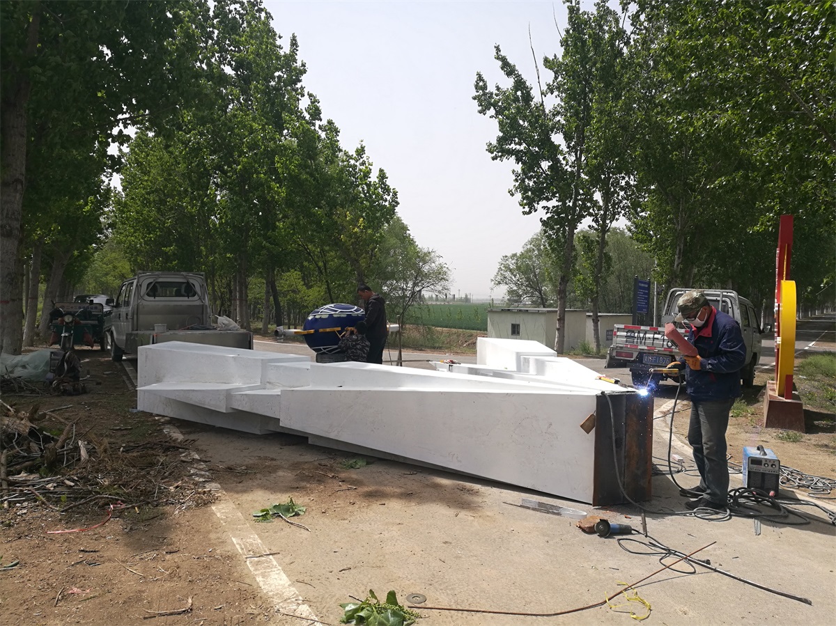 雕塑整體呈扇形構(gòu)造,代表黃河三角洲扇形外貌;兩側(cè)形似利劍,寓意治黃工作者敢于“亮劍”的拼搏精神; 中間球形,寓頂點(diǎn)之意;其上印制有黃河水利委員會標(biāo)志,圍繞十只和平鴿。寓意以治黃事業(yè)為中心、人民幸福、和平安寧、生態(tài)保護(hù)、空間均衡;主體色彩以紅、黃、藍(lán)搭配。紅色代表黨建引領(lǐng),黃、藍(lán)象征海河交匯。寓意治黃事業(yè)在中國共產(chǎn)領(lǐng)導(dǎo)下開創(chuàng)新篇章。